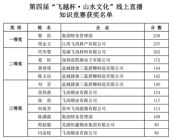 1月13日晚,飞尚团体第四届“飞越杯·山川文明”线上直播常识比赛正式竣事。按照比赛法则,统计一切参赛者的终究得分,飞尚团体财政操持部黎浩、江西飞尚林产无限公司周金玉别离以238分、237分的成就取得一等奖,芜湖飞尚资料无限公司取得最好构造奖。