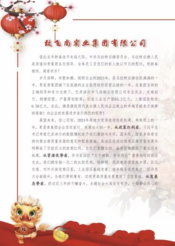 春节邻近,内蒙古乌拉特后旗党委、当局向飞尚团体发来贺信并致以节日祝愿。信中提到,团体成员企业飞尚铜业无限公司专一实业、克难前行、妥当运营,产量再立异高,2023年缔造产业总产值65.2亿元,上缴国度税收0.56亿元。